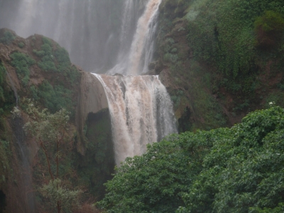 Zum Frühstück wollten wir nach „Afrika“, die anderen hatten davon gehört und wollten sich anschließen. Wir warten darauf, dass der Regen aufhört und brechen dann auf. Jemand fragt, ob dort auch wirklich offen ist – woher sollen wir das wissen? Der Gang nach „Afrika“ ist nicht schön, wir stampfen durch den Lehmmatsch, es ist glitschig und ungemütlich und als wir ankommen sehen wir, dass es dort a) sehr zu ist und b) sehr nach gestriger Fete aussieht. Eine Gitarre und ein Banjo stehen noch draußen. Wir stehen so rum und beraten, da kommt ein völlig verpennter Marokkaner aus der Hütte, der uns andeutet, wir könnten blieben, er würde sich kümmern. Wir ziehen es allerdings vor, doch zu gehen – so gemütlich wie gestern beim schönen Wetter ist es heute dort „so ganz in grau“ nicht mehr. Also gehen wir doch wieder rüber auf die andere Flussseite Richtung große Treppe. Es bleibt alles beim Alten: Omlette fromage und Cafe noir und zu Michaels Freude entdecken wir ein „europäisches“ Klo.