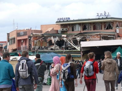 Nachdem ich MB zum Aufbruch „überredet“ habe, wandern wir die Einkaufsstraße Richtung Zentrum, landen am Place Jemaa el Fna und unser Blick wird sofort auf das zerbombte Cafe gelenkt. Augenscheinlich ist die Bombe im 1. Stock explodiert. Ich zögere, ob ich fotografiere, tue es dann aber doch. Dieses Foto gehört – wie dieses Erlebnis – eben auch zu unserer Reise und es hat sie ja zum Ende hin auch stark beeinflusst.