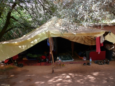 Dann sitzen wir in der Höhle, es regnet schon wieder. In einem trockenen Moment bekommen wir Besuch von der Affenbande. Diesmal trauen sie sich bis auf die Terasse und Christian füttert sie mit den restlichen Bananen, das ist doch wenigstens etwas artgerechter! Zum Nachmittag hin kommt Martin vorbei und wir besprechen die Übernachtungssituation. Die meisten Zelte sind durch den Dauerregen pitschnass und eingesaut. Wir haben die Wahl: Entweder Khaima oder Zimmer. Selbstverständlich entscheiden sich die meisten für Khaima, wann hat mensch schon mal die Möglichkeit in einem Berberzelt zu übernachten. Nur eine unserer Mitreisenden entscheidet sich für das Zimmer. Sie ist stark erkältet, hat Fieber und sehnt sich nach Ruhe und Wärme. Wir räumen die Zelte aus und nun erkenne ich, warum es nachts so laut neben meinem Ohr gequakt hat. Unter der Zeltplane hat sich ein Krötenpärchen versteckt und schaut nun völlig verdutzt, dass die Deckung weg ist. Gerade scheint einen Moment die Sonne und wir hoffen auf trockene Zelte zum Einpacken. Wir beziehen das Khaima, das mit Matratzen bestückt ist, gerade ausreichend für uns alle, in der Mitte durch einen Vorhang getrennt.