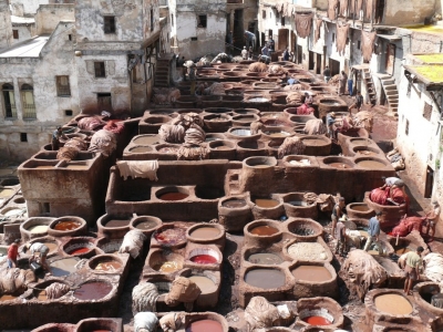 Besonders beeindruckt hat uns das Viertel der Gerber. Von der Galerie eines Lederwarengeschäfts können wir auf die arbeitenden Gerber herunterschauen. Schon am Eingang bekommen wir einen Stängel stark duftender Minze in die Hand gedrückt. Noch weiß ich nicht wofür, doch als wir auf der Galerie stehen, wird mir der Sinn schnell klar. Ein beißender Gestank liegt über dem Gerberplatz. Die Arbeiter balancieren in hochgewickelten Hosen auf den Bottichrändern der Kalkbecken und Gerbertöpfe. Sie arbeiten ohne Schutzhandschuhe, stehen oft bis hoch an die Oberschenkel in den Töpfen mit der Gerberlohe. Ein Angestellter des Lederwarengeschäfts will uns weis machen, es würden nur „natürliche“ Mittel verwandt, zum Gerben Taubenkot, zum Färben Mohn (rot), Safran (orange), Minze (grün) und Indigo (blau). Doch wir können das ziemlich schwer glauben und auch der Reiseführer in Schriftform lässt verlauten: „es wird meist mit Chemikalien gearbeitet“. Mein Zoom des Fotoapparates holt mir dann auch einen Sack mit Ammonix (Ammoniak) vor die Linse. Sonst allerdings ist nichts zu sehen, was auf die Beimischungen schließen ließe. Der Rückweg durch das Lederwarengeschäft zeigt ein großes Angebot von Lederwaren aller Art. Steffi liebäugelt mit einer Lederjacke – Startpreis 350 Euro – sie wechselt den Besitzer nach langen zähen Verhandlungen für 120 Euro und Steffi kann sich zusätzlich noch ein paar marokkanische Schlappen aussuchen.