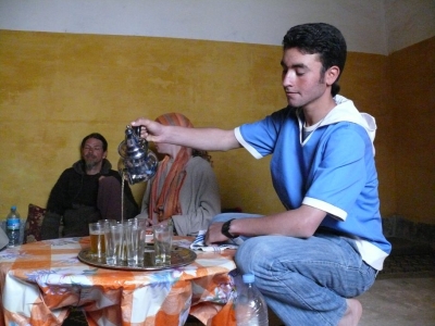 Martin hat derweil seine Dorfbekanntschaft erneuert. Er war hier schon mal vor einigen Jahren. In dieser Zeit hat er auch unsere Gastgeberfamilie kennengelernt. Damals war der ältere Sohn Mohamed krank, er hatte schon seit Tagen hohes Fieber und der Vater war zu Fuß losgegangen, um Aspirin zu holen. Martin hat den Jungen ins Krankenhaus gefahren und gilt dort nun als Retter. Entsprechend groß war die Freude auch bei dem kleinen Mohamed, derweil wohl so um die 10 Jahre alt und seiner Familie. Martin war schon mal mit einer Gruppe in Aoli und einige Familien im Dorf reißen sich darum, uns aufzunehmen. Diesmal sind die Eltern von Mohamed „dran“, obwohl Quidel und Melida sehr beengt auf der anderen Seite des Flusses wohnen, haben sie es sich sehr gewünscht. Wir schultern unser Gepäck und los geht es durch das Dorf und über eine stabile Hängebrücke. Etwas verlegen stehen wir vor der einfachen kleinen Lehmhütte, werden aber energisch herein gewinkt. Wir ziehen im dämmrigen Flur die Schuhe aus und betreten das einfach eingerichtete Wohnzimmer der Familie. Der Lehmboden ist mit schönen Teppichen bedeckt, bunte Kissen lehnen an der Wand. In einer Ecke steht eine kleine Kommode mit einem Gaslicht. Ein kleines Fenster mit verziertem Gitter und einer Plastikplane anstatt einer Glasscheibe gibt ausreichend Licht. Wir nehmen auf den Teppichen Platz und werden gleich mit Tee bewirtet. Dazu reicht Melida selbstgebackenes Fladenbrot und Sit (Öl). Quidel und Melida freuen sich sehr, dass wir ihre Gastfreundschaft angenommen haben. Melida wird heute für uns kochen, Zutaten haben wir hoffentlich reichlich mitgebracht, so dass es auch darüber hinaus noch für die Familie reicht. Viele Stunden später wird das Couscous mit Gemüse und Fleisch fertig sein. Melias Küche ist ein kleines Eckchen am Ende des schmalen Flurs. Arbeitsplatte ist der Lehmfußboden, auf einer kleinen Kommode an der Wand steht ein 2-flammiger Gasherd, gespeist von einer Gaskartusche.