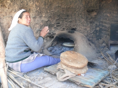Zurück bei unseren GastgeberInnen müssen wir feststellen, dass Melida schon wieder am Kochen ist, zwischenzeitlich backt sie draußen in einem kleinen Verschlag mit Holzofen ihr Fladenbrot. Am Morgen hatten wir ihr noch zugesehen, wie sie auf dem Boden kniend den Teig in einer flachen Holzschüssel geknetet hat. Eigentlich sieht unser Zeitplan ein Essen nicht mehr vor. Wir hatten auch versucht dies zu kommunizieren - wohl vergebens - aber eine Ablehnung kommt natürlich nicht in Frage.