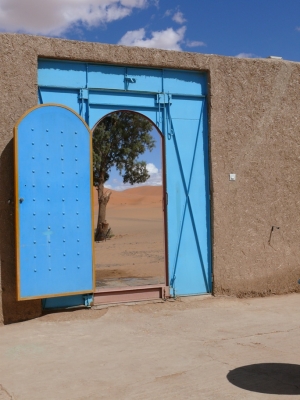 Nach dem gemütlichen Abstieg, der wieder keinen Skorpion, wohl aber div. Mistkäfer vorhält, stürmen wir das Hotel und die Duschen. Lauwarmes Wasser spült den Saharasand aus Haaren und Augen, ein tolles Frühstück mit warmen Eiern, gerollten Pfannkuchen, KiriKiri-Käse (anderen Käse gibt es nach unserer Erfahrung nicht in Marokko), Marmelade, Margarine und Öl wird für uns serviert. Und nun klärt sich auch, was das seltsame Geräusch in der Nacht war. Am Rande des Erg Chebbi hat ein dreitägiges Musikfestival stattgefunden, das uzz-uzz der Techno-Musik der letzten Musiknacht schallte dabei bis in den frühen Morgen über die Wüste.