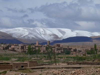 Die Fahrt geht entlang des Hohen Atlas in Richtung Ouarzazate. Die Strecke führt wieder durch Sandwüste, seitlich begleitet von den schneebedeckten Gipfel des Jebel Ougnat und dem Jebel Saghro. Vereinzelte Akazienbäume und andere Büsche vermitteln einen Eindruck von Steppe, eigentlich gehören hier noch Giraffen, Elefanten und Antilopen hin, dann wäre das Bild perfekt. Doch schon die alten Römer haben dafür gesorgt, dass es hier kein Großwild mehr gibt.