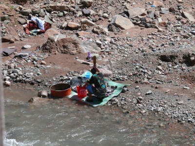Am späten Vormittag kommen wir in die Gegend, für die Steffi und Martin einen „Spaziergang“ etwas abseits der Straße in ein Seitental hinein geplant haben, um dort ein abgelegenes Dorf zu besuchen. Zwei Stunden sind dafür angesetzt. Ich warne schon mal vor, da ich nicht weiß, was mein Ischias dazu sagen wird – lieber einen Tag etwas sachte, als den Rest des Urlaubs Schmerzen. Und es ist auch kein Problem, da der Hin- und Rückweg derselbe ist. Langsam trotte ich hinterher. Michael, der bei mir bleibt, muss sich nicht langweilen, hier – wie fast überall auf dieser Reise – gibt es ohne Ende Fossilien zu entdecken. Ich bin sehr neugierig, wie hoch der steinige Anteil unseres Gepäcks am Ende der Reise sein wird. Unten am Fluss kniet eine Frau, das hölzerne Waschbrett vor sich und bearbeitet ihre Wäsche. Wir wandern in das enge Tal, das Wetter zeigt sich von seiner guten Seite, die Sonne scheint. Langsam nähern wir uns dem Dorf. Rechts des Weges spielen drei Jungen am Rande eines Baches. Sie sind so in ihr Spiel mit einem Stöckchen vertieft, dass sie uns gar nicht wahrnehmen, obwohl hier doch Touris noch unter „Sensation“ verbucht werden und oft um Money oder Stilos angebettelt werden. Weiter geht es ins Tal hinein. Ein kleiner Junge, ca. 4 bis 5 Jahre alt, rennt hinter Michael her und hält die Hand ziemlich aufdringlich auf. Doch Kinder bekommen kein Geld von uns, obwohl Michaels weites Herz hier ganz schlecht „Nein“ sagen kann. Aber die Erfahrung darf sich nicht in den kleinen Köpfen festhaken, dass Schule vielleicht gar nicht nötig ist, um an Geld zu kommen.