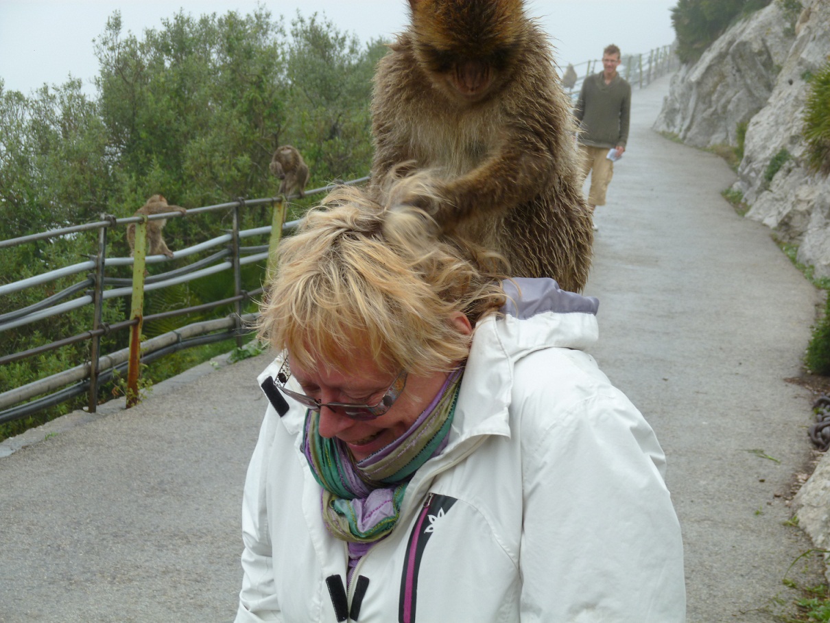 Das Wetter ist sehr britisch, Nebel umhüllt die Felsen und es nieselt. Die Makaken, die uns hier hochgelockt haben, stört das aber nicht weiter. Die ersten, die wir treffen, spielen auf der Aussichtsplattform in einer dicken Pfütze. Gibraltar soll britisch bleiben, bis zu dem Tag, an dem es dort keine Affen mehr gibt. Daher werden sie gefüttert, gehegt und gepflegt und sind entsprechend frech. Wir machen einen kleinen Gang – rechts rum und treffen unterwegs noch jede Menge der possierlichen Tiere. Sie sind wirklich frech, erst wird Michael von einem angesprungen, der intensiv nach Essbarem sucht, kurz darauf habe ich einen auf der Schulter, der in meinen Haaren wühlt – will er mich flöhen? Wir sind uns einig: Die Affen machen den Reiz Gibraltars aus, gäbe es sie nicht, hätte sich die Fahrerei dorthin nicht gelohnt. Die Innenstadt von Gibraltar ist zwar ganz nett innerhalb der Stadtmauern, aber über allem thront immer noch die koloniale Einstellung der Briten mit viel Kriegsgetöse.