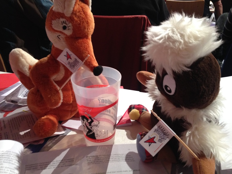 Und dann habe ich noch den Fuchs und Pittiplatsch für meine beiden Süssen gekauft. Sie durften während des Parteitages auf dem Tisch sitzen, die EL-Fahne halten und aus dem 1. Mai-Becher der Berliner Linken trinken.