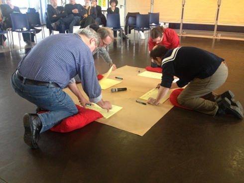 Der Knackpunkt des Auftakts war: Traut sich jemand in die Mitte und fängt an? Ich befürchtete schon 4 Schweigeminuten und wollte mir gerade überlegen, was ich wohl aufschreibe, da kam schon der erste in die Mitte und schrieb das Thema auf, über das er in einer Arbeitsgruppe reden wollte. Bann gebrochen und ruck-zuck wurden über 20 Arbeitsgruppen vorgeschlagen, die auch im Laufe des Tages – mal mit 2, mal deutlich mehr Teilnehmer_innen beackert wurden.