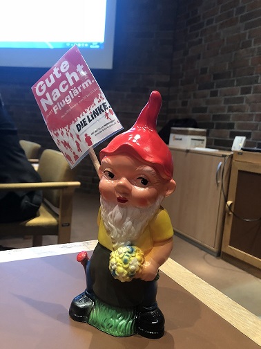 Als kleinen Hingucker hatte ich zu dieser Sitzung einen meiner Lieblingszwerge aus dem Wahlkampf aus Hessen dabei, der mit dem Schild „Gute Nacht statt Fluglärm“ einen der Schwerpunkte der aktuellen Sitzung markierte. Verbotenerweise habe ich ihn im Ratssaal fotografiert ;-). Als die stellvertretende Ratsvorsitzende Ulrike Jagau (Grüne) die Ratssitzung am 05.11.2018 pünktlich um 18.30 Uhr eröffnete, sprach sie optimistisch davon, dass es heute eine zügige Sitzung geben werde. Wie mensch sich irren kann. Diesmal ging es bis kurz vor 22 Uhr, obwohl ein Teil der Drucksachen im hinteren Teil der Tagesordnungen bloc abgestimmt wurden. Bereits in der Einwohner*innenfragestunde wiesen die Vertreterinnen der BON-HA (Besser ohne Nachtflug- Hannover Airport) auf die zunehmende Belastung der Bevölkerung durch den Nachtflug am Flughafen Hannover-Langenhagen hin. Ich hatte dazu einen Antrag eingebracht, der eine finanzielle Unterstützung der Klage der BON-HA zum Nachtflugverbot beinhaltete, mehr dazu weiter unten im Text.